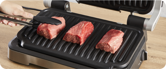 Пластины гриля расположены под углом 7°, поэтому стейк именно жарится, а не варится в собственном соку, как бывает при использовании сковород.