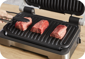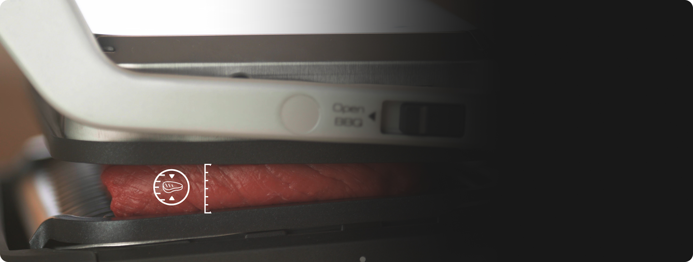 Гриль автоматически определит толщину ингредиентов с точностью до 1 мм и задаст настройки времени приготовления и температуры для достижения желаемой степени прожарки.